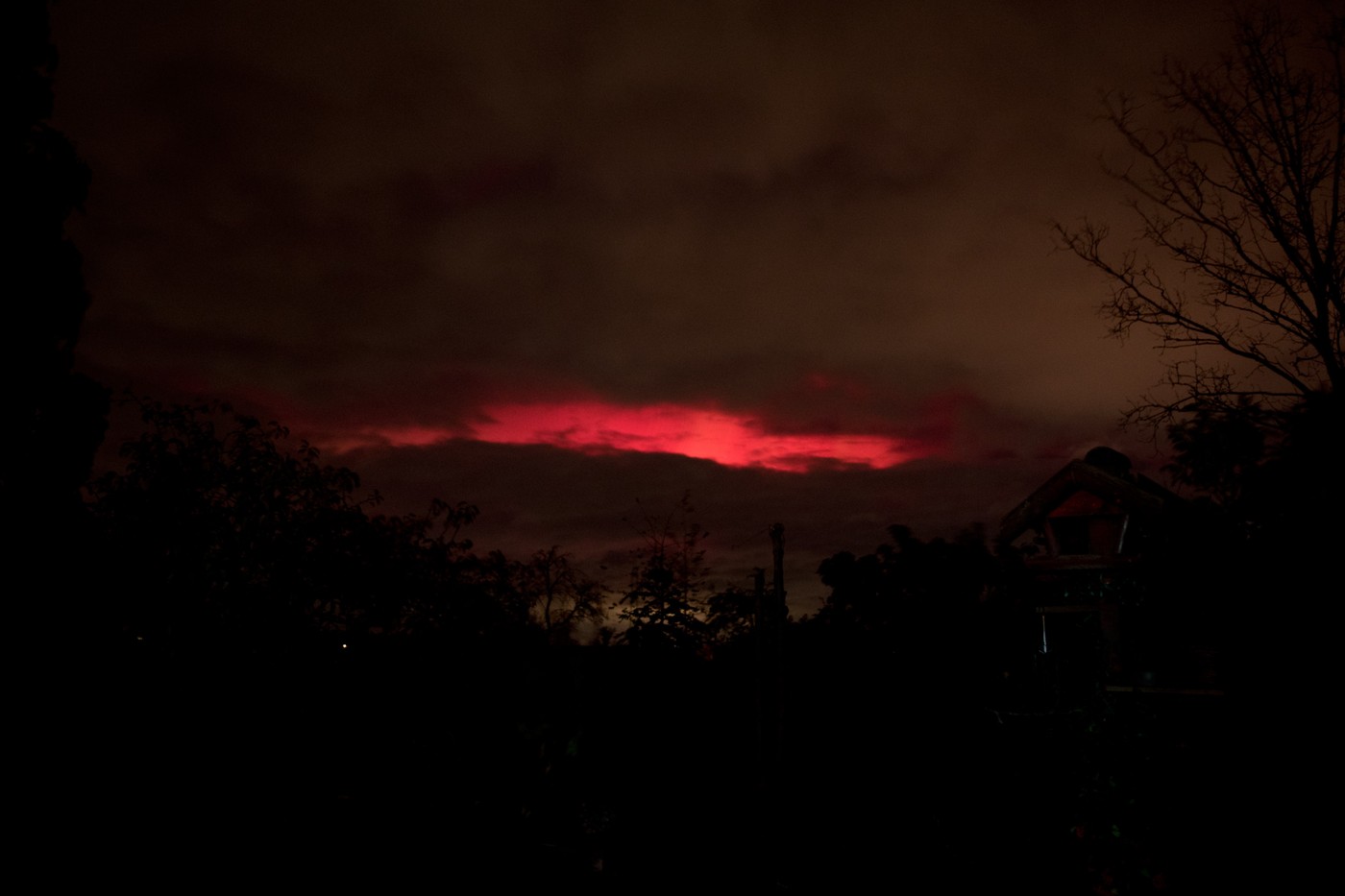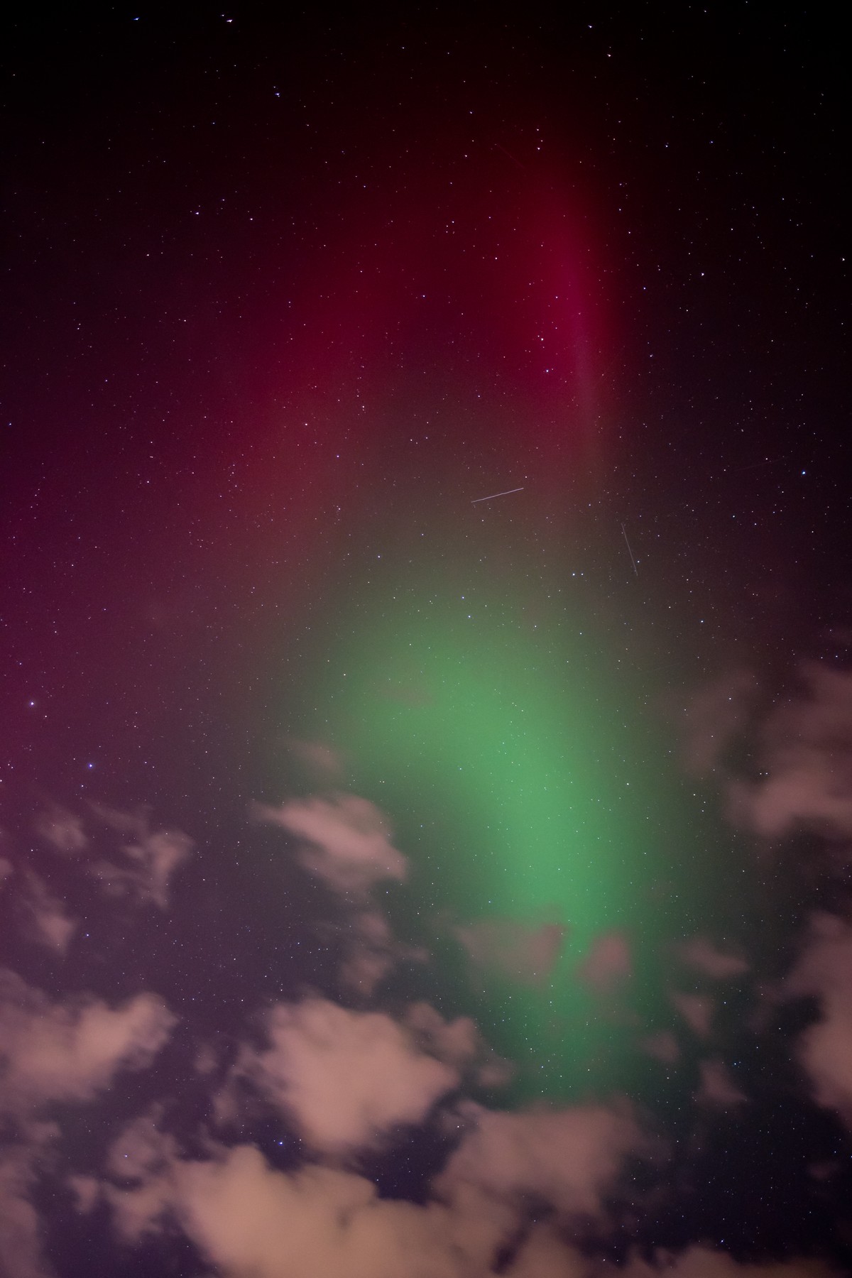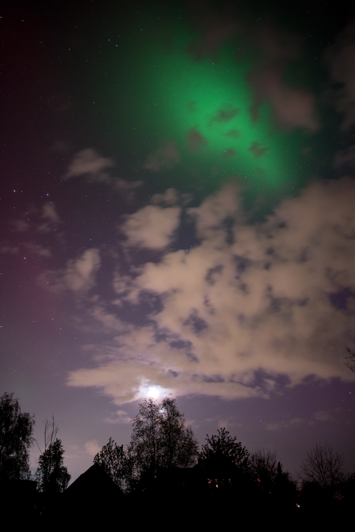 Das hellste mit dem Auge sichtbare Rot, was ich bisher beobachten konnte, leider nur zwischen Wolkenlücken versteckt. Polarlichter sehen also manchmal doch aus "wie auf den Fotos"...