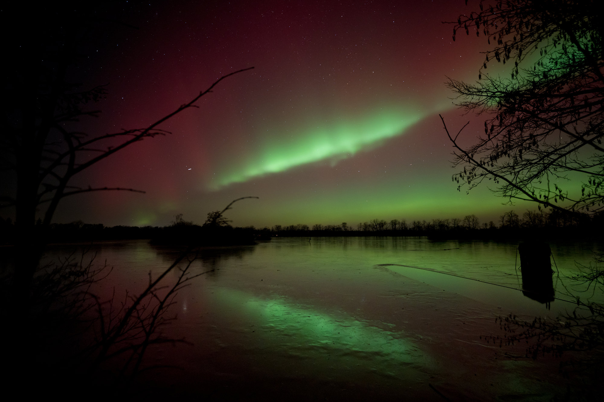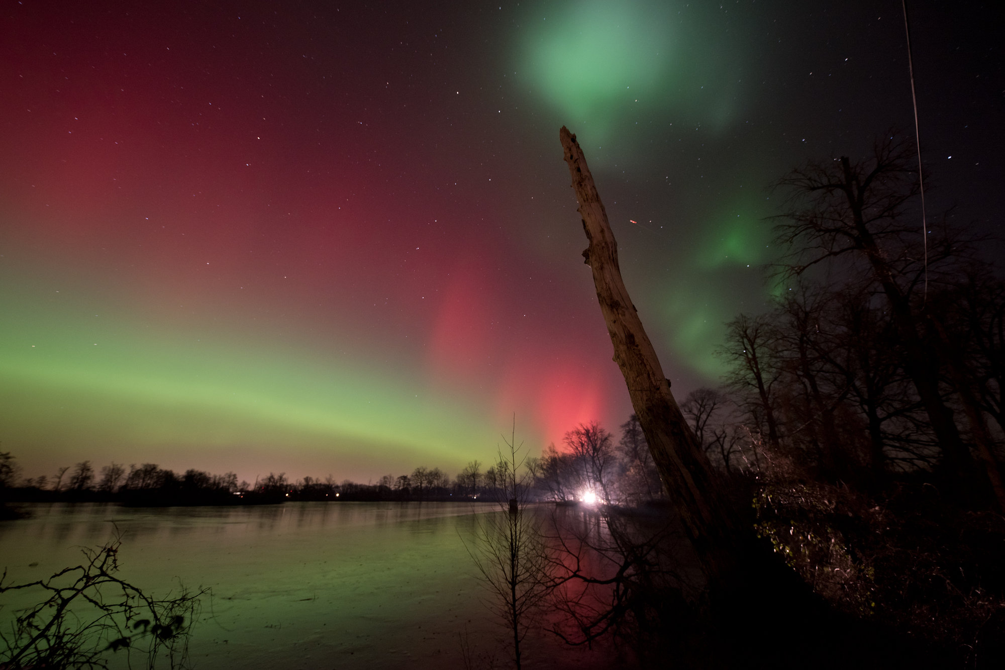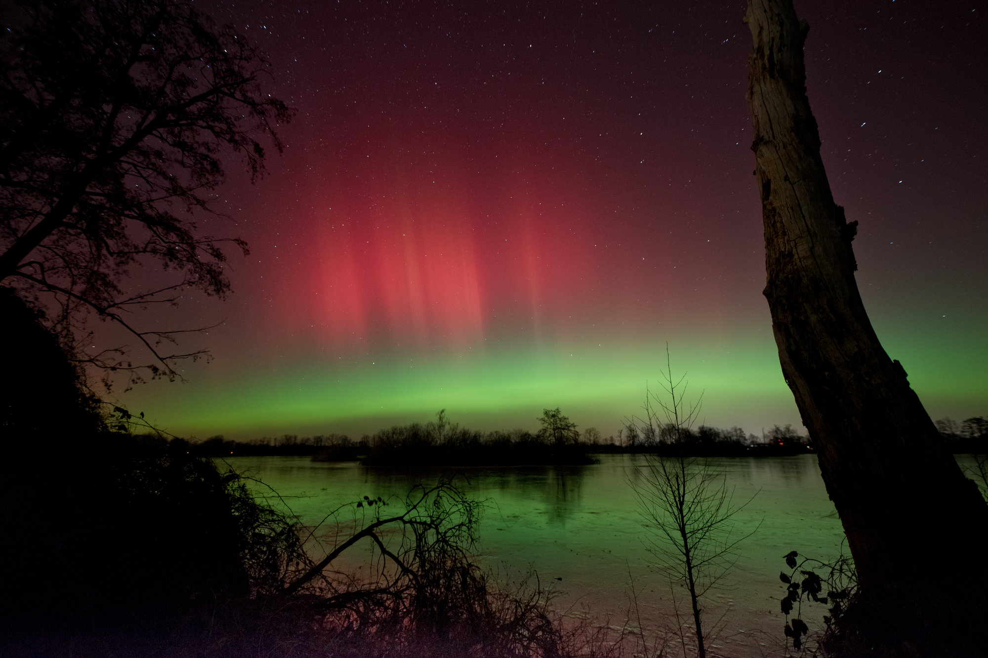 Die Bilder sind natürlich technisch aufgearbeitet, aber auch visuell war dieser Polarlichtausbruch der größte, den wir in Mitteleuropa erleben durften. Dank dem satten Rot konnte man auch das Grün gut visuell erkennen. Ohne Rot (live getestet durch Zuhalten des roten Bereichs) verblasst das Grün sofort, weil das Auge dann irgendwie in einen Nachtsichtmodus wechselt... Anders gesagt, will man sattes grünen Polarlicht sehen, braucht man eine rote oder oder andere nicht-grüne Lampe in der Ausrüstung! Klingt komisch, ist aber so...