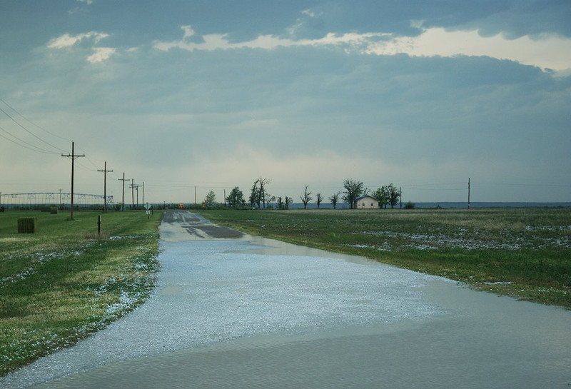 Danach verlassen wir den Ort, wo das letzte Bild entstand, um etwas auf Sicherheitsabstand zu gehen. Und das war auch gut so. Als wir 10 Minuten später nach Durchzug des Hagelkerns wieder dahin sind, lagen dort eine Menge großer Hagelsteine!
