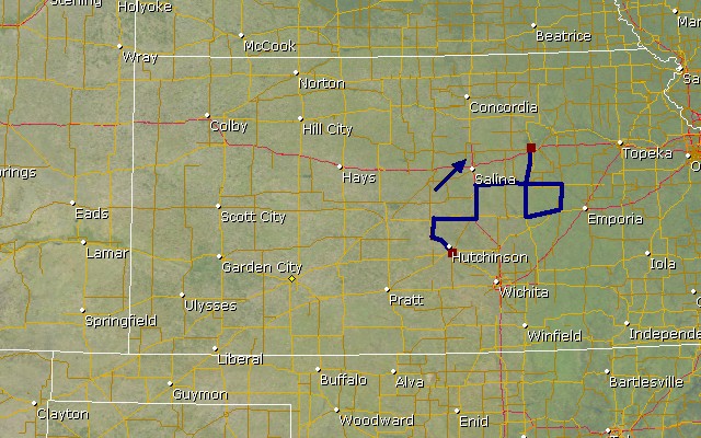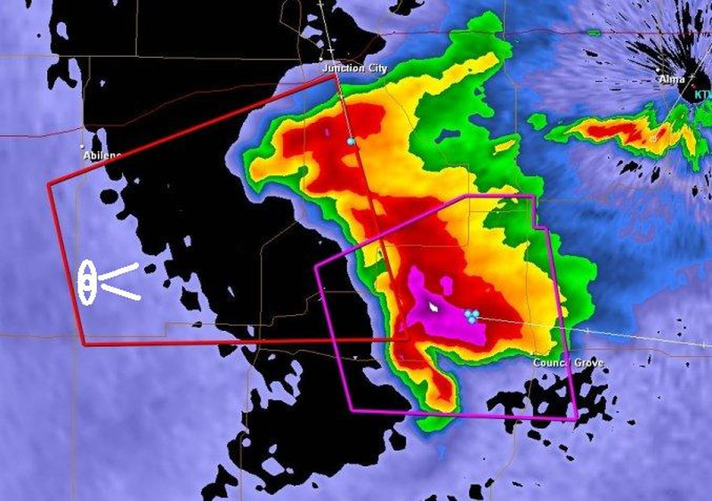 Das Vorhersagemodellen "RUC" hat heut den ganzen Tag im Dreieck Wichita-Emporia-Salina eine kleine, aber markante Hebungszone ab ca. 17 Uhr Ortszeit vorausgesagt. Dadurch und unterstützt durch die sonstigen Parameter könnte noch vor Sonnenuntergang eine alleinstehende Superzelle entstehen.