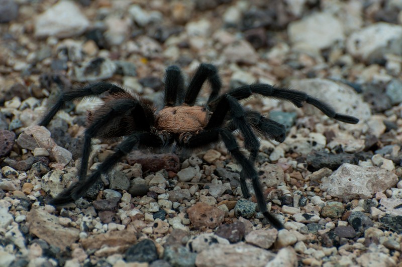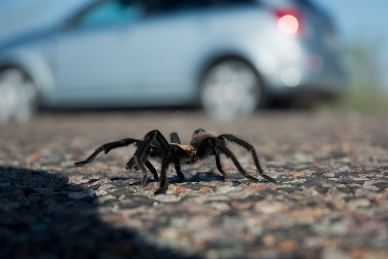 Die Riesenspinnen (15 cm war die Größte, die wir gesehen haben) laufen da scheinbar ziellos neben und über die Straße. Wir haben das eine ganze Weile beobachtet, konnten den Sinn dahinter aber bisher nicht enträtseln...