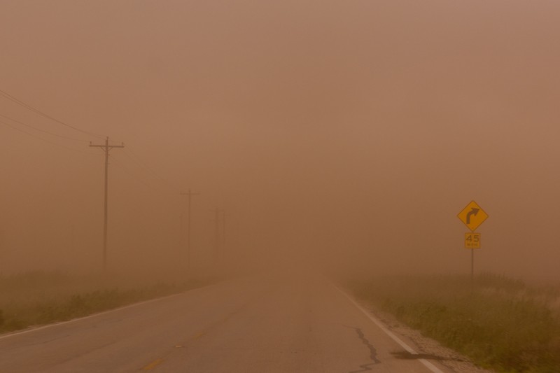 Dann wurde es richtig gespenstisch... die Abwinde der Gewitter haben die ganze Gegend nördlich Big Spring in Staub gehüllt. Fraglich war vor allem, wo der Staub eigentlich herkommt, denn die meisten Felder dort waren nass oder gar überflutet. Man möchte dieses Jahr eigentlich meinen, hier in einem Reisanbaugebiet zu sein.