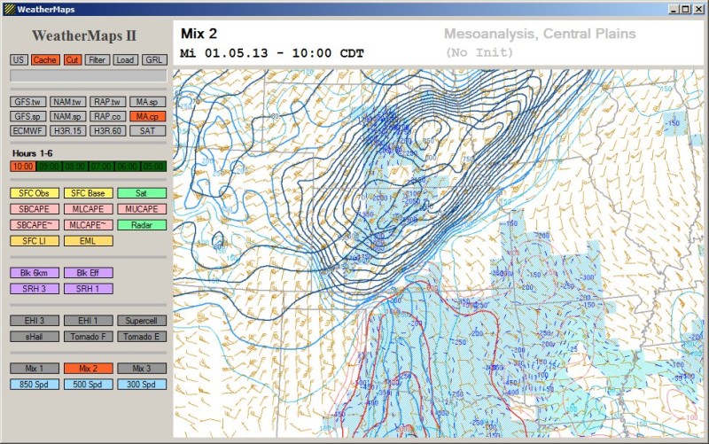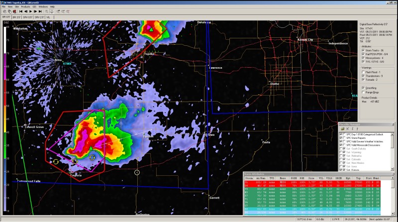 Diese Software bietet verschiedene Doppler-Radardaten mit Zelltracking und ist mit etwas Geschick über sogenannte Place- und Shapefiles mannigfaltig erweiterbar. Bei uns wird neben den Radardaten die eigene Position (aus dem GPS-Empfänger), ein detailliertes Straßennetz, das aktuelle Satellitenbild sowie SPC-Outlooks, -Warnungen, -Watches angezeigt.