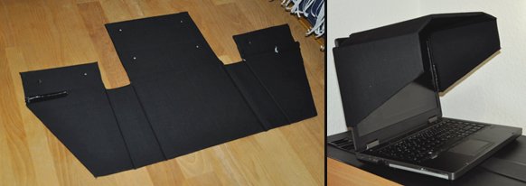 Es handelt sich um eine aus Pappe, Klebeband, schwarzen Stoff und Küchengummis gefertigte Haube. Endlich perfekte Sicht auf das Laptopdisplay, egal, wo die Sonne steht.
