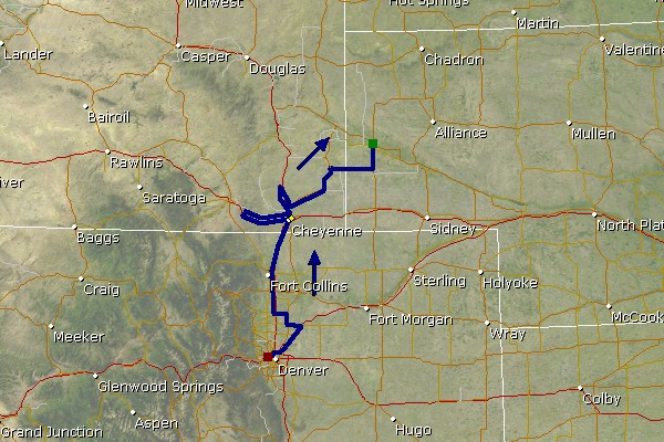 Es löste relativ zeitig an verschiedenen Stellen aus, unter anderem südwestlich von Laramie, WY: