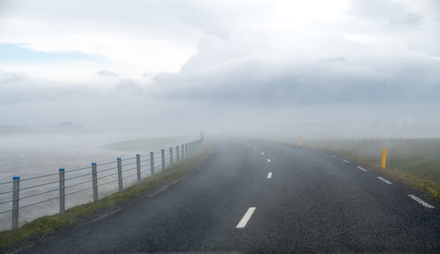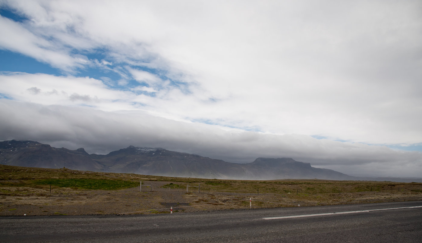 Und so suchen wir 3 Tage Orte, wo es neben dem Sturm mal hier und da auch Sonne dazu gab. Hat auch ganz gut geklappt das "Wolkenlücken Chasing", wir verbringen diese Tage erst im Westen, dann im Süden von Island. Wobei am Ende die Wolkenlosigkeit den Sturm noch verschärft hat. Der Föhn-Effekt brachte noch mal mehr Geschwindigkeit auf dass Anemometer... Hier die Verdunstungskante des Nord-Föhns: