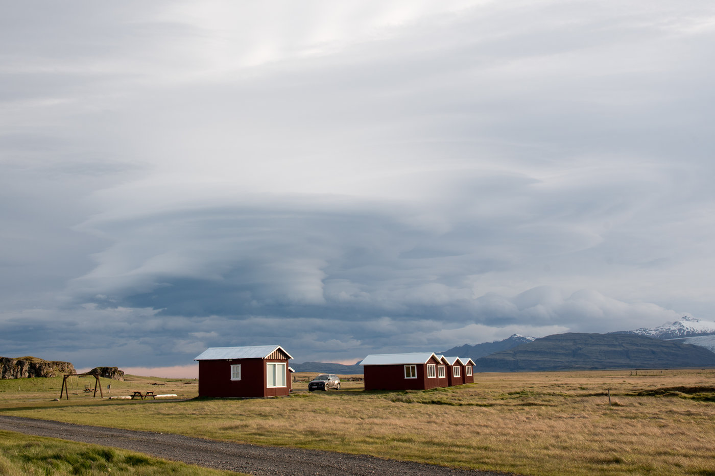 Unsere Unterkünfte waren meist Cottages wie im nächsten Bild. Das waren 3 Tage Übernachtungen auf Schiff bei hohem Seegang... Interessante Erfahrung, aber brauchen wir nicht nochmal... Lenticulares-Wolken auf der Lee-Seite der Berge: