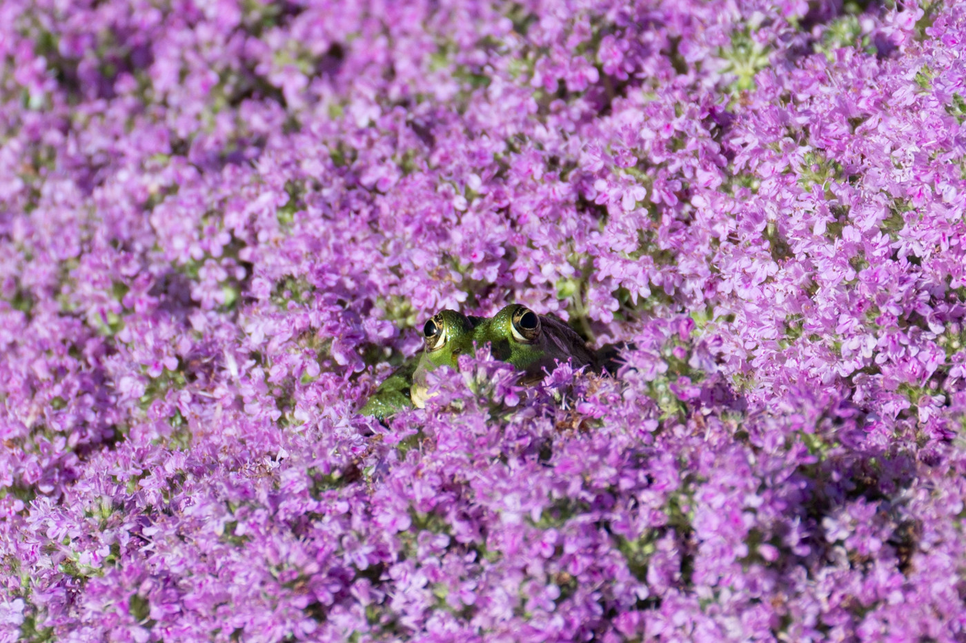 Eine weiter unerwünschte Situation hat sich bei den Schmetterlingen ergeben. Die Frösche im Teich vertilgen Unmengen davon. Wenn man das mal eine Weile beobachtet, erklärt das die Schmetterlingsarmut im Garten. Teils sitzen diese im Dutzend um Seerosen oder Blühpflanzen und schnappen einen Schmetterling nach dem nächsten im Anflug weg... Hier z.B. im Thymian: